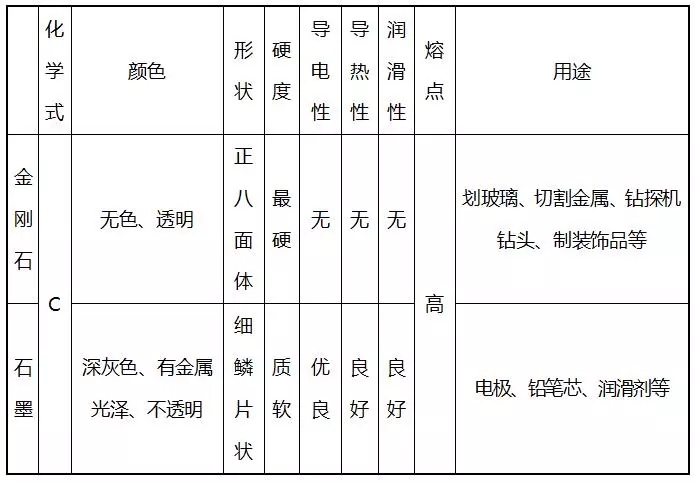 从上面对比中我们看到金刚石、石墨都是由碳元素组成的单质,但是构成它们的碳原子的排列方式不同,造成了它们的物理性质基本相反,金刚石硬度最硬而石墨质软,金刚石不导电而石墨确实良导体。