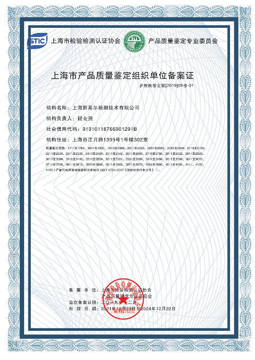 上海新蓦尔检测技术有限公司产品质量鉴定部(简称SKYLABS或天纵鉴定)在2019年12月通过了上海市质量协会对我们产品质量鉴定部门的能力审核,经过相关技术专家的认真评审,最终我们通过了21大类470余小类产品的质量鉴定能力范围的确认。本次上海市质量鉴定协会所批准和认可的具体的类别包括了: