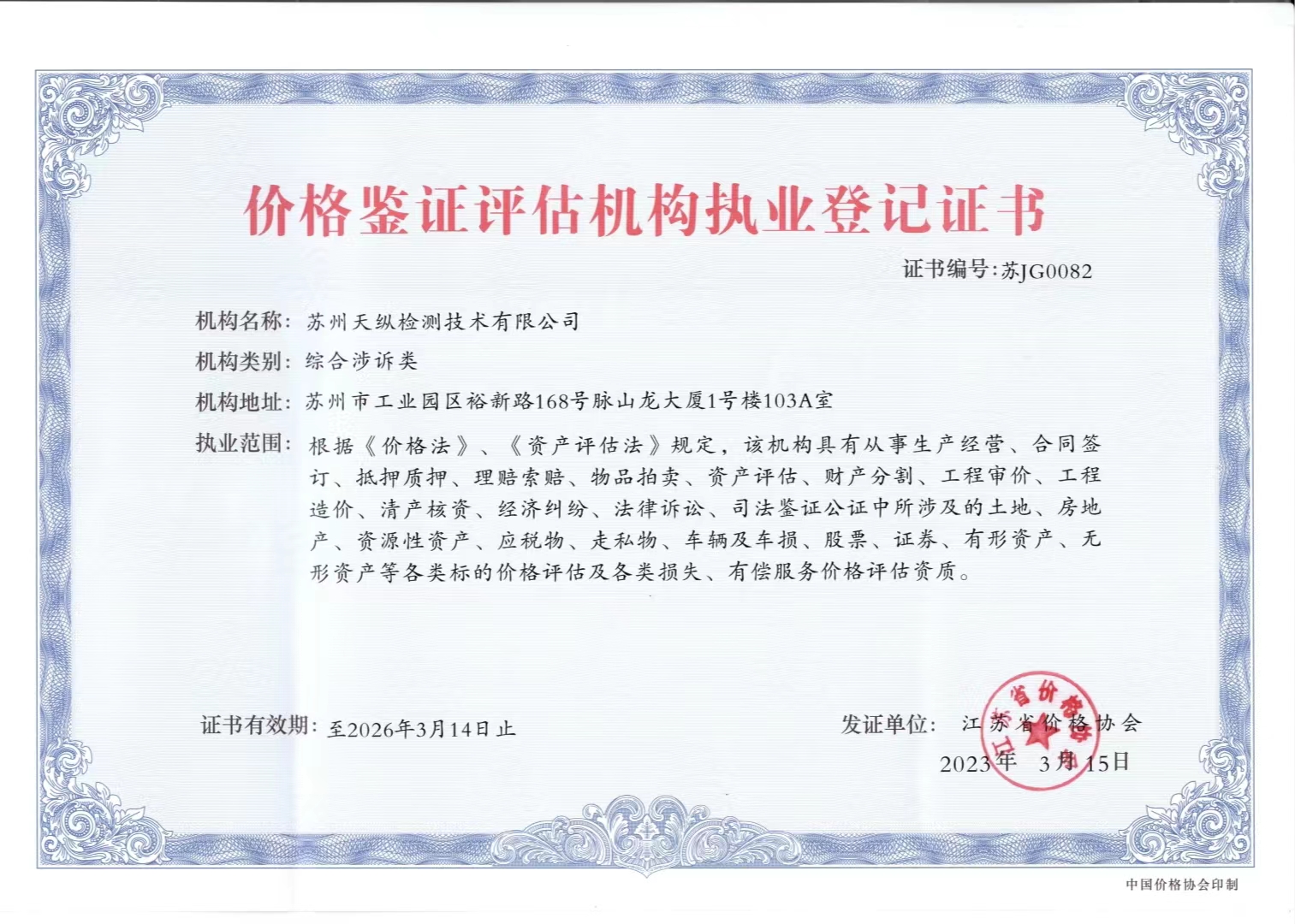 2023年3月,苏州天纵检测技术有限公司经江苏省价格协会批准执业登记,获“价格鉴证评估机构执业登记证书”。