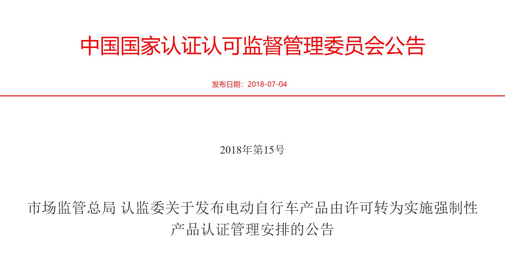 天纵检测(SKYLABS)注意到:在2018年7月4日市场监管总局认监委对外发布公告确认电动自行车产品将从生产许可证管理转变为实施强制性产品认证(以下简称CCC认证)管理并与新版标准实施协调一致的要求。