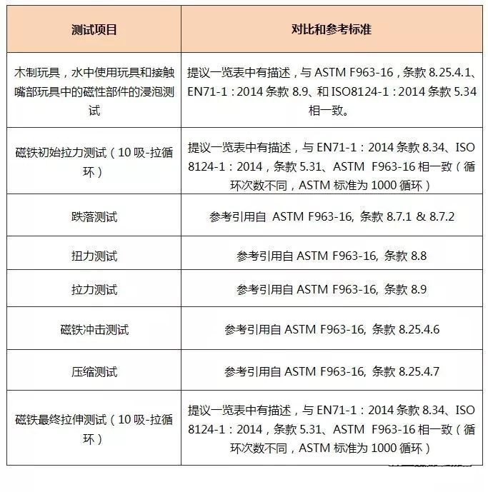 本次加拿大拟定增加的对磁性玩具和磁性部件完整性测试要求如下表所示: