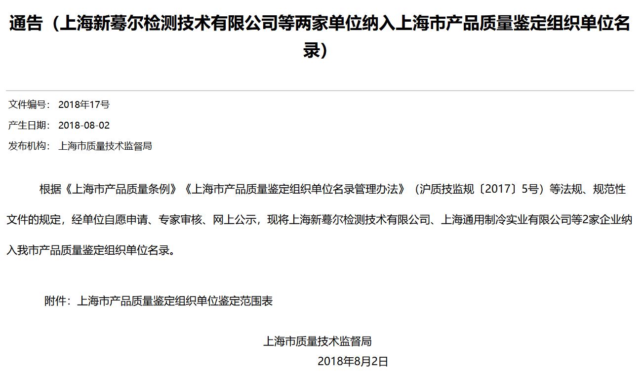 2018年8月2日,上海市质量技术监督局正式下发通告,正式确认将上海新蓦尔检测技术有限公司(天纵检测)正式纳入了上海市产品质量鉴定组织单位名录中。