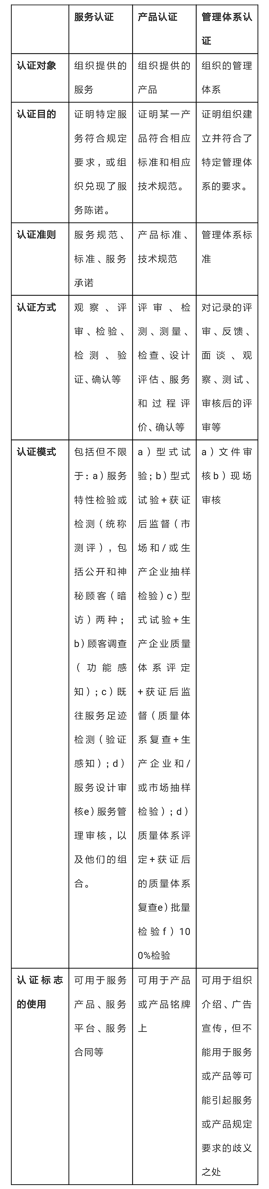 这三大类认证在认证对象、认证目的、认证准则、认证方式、认证模式、认证标志的使用上存在明显的差异,天纵检测(SKYLABS)参考了相关资料,列出下表,以便明确三种认证的区别所在。