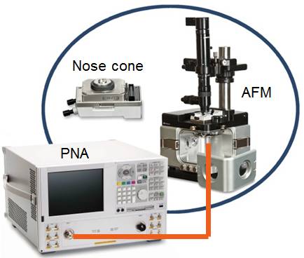 原理上扫描微波显微镜可以利用矢量网络分析仪(vector network analyzer, VNA)通过激励信号源对 AFM 铂铱探针发射一束微波信号,在样品表面扫描过程中,从针尖反射回来的微波信号被 VNA 采集并加以分析。通过计算反射信号与入射信号的比率及相位差,再结合物理模型就可定量获取材料的电学性质。