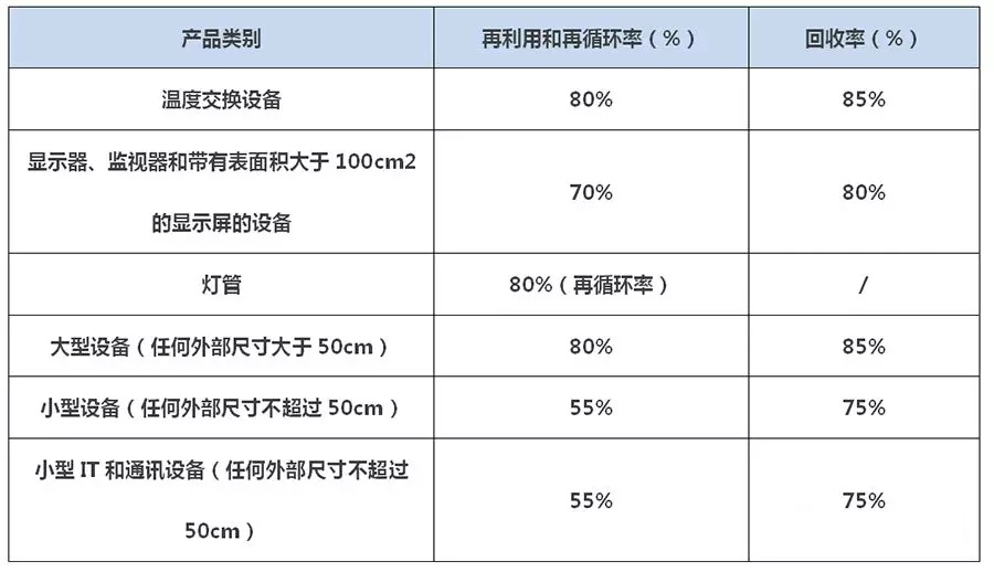 WEEE指令中各类产品的回收目标如下: