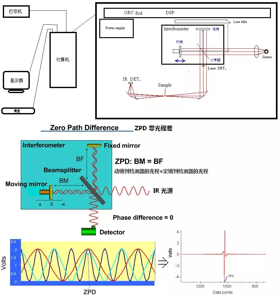 因此傅立叶变换红外光谱测量的全过程是:光谱仪发射红外线通过被测物,在红外线通过被测物时,会引起被测物中分子的振动,同时分子振动吸取特定的能量(不同波长的红外线),干涉仪测量出原始的干涉图,该图是一种时域谱, 它是一种极其复杂的谱, 难以解释,因此计算机再对该干涉图进行快速傅立叶变换计算, 从而得到以波长或波数为函数的频域谱, 即红外光谱图,纵坐标为透过率,横坐标为波长λ(μm)或波数(cm-1)。因此谱图称为傅立叶变换红外光谱,我们把这种仪器也就称为了傅立叶变换红外光谱仪,因此我们也把傅里叶红外光谱仪叫做“微观世界的振动台”。