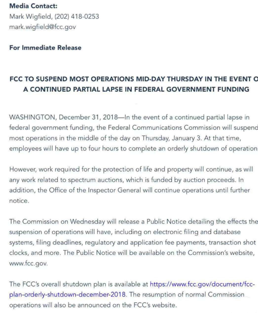 由于美国政府新的预算仍然未能批复, 美国联邦政府不得不部分关闭,美国联邦通信委员会FCC也被迫暂停了大部分的业务。FCC在早先的一份声明中称:若联邦政府资金未能在周四恢复,FCC 将开始“有序地关闭运营”,过程预计需要耗费四个小时。不过,用于保障生命和财产安全所需的工作、以及频谱拍卖相关的业务,将会继续进行。在此期间,FCC监察长办公室将继续运作,直至另行通知。