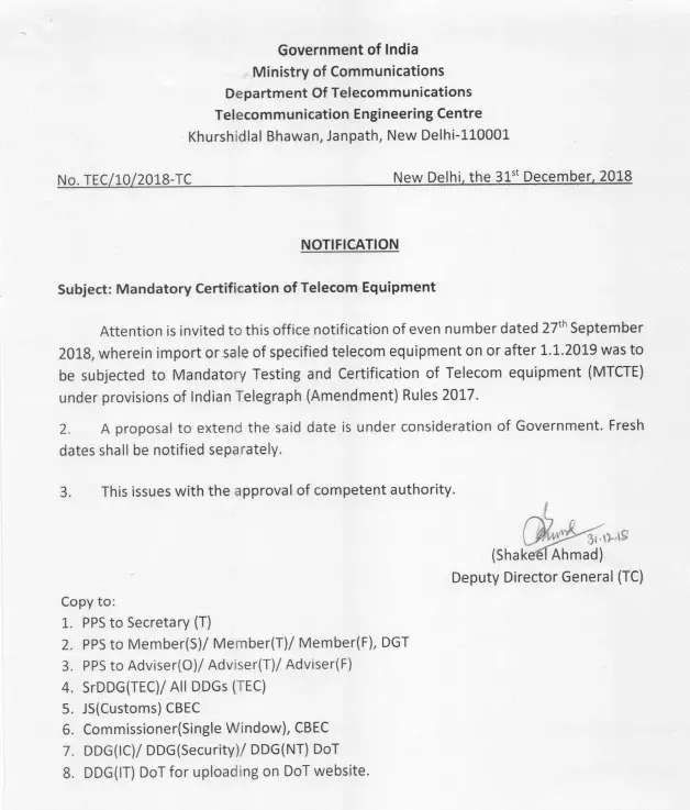 在2017年9月5日印度通讯部发布规则,规定任何电信设备必须在销售,进口到印度前进行强制性测试和认证(MTCTE),并于2018年10月1日执行。其要求在TEC认可的实验室进行测试并获得基于Essential Requirements(ER)的测试报告,证书由TEC发出。2018年09月27日,印度通讯部发布公文延迟了强制执行MTCTE(TEC认证),分批延期至2019年1月1日和2019年04月01日。