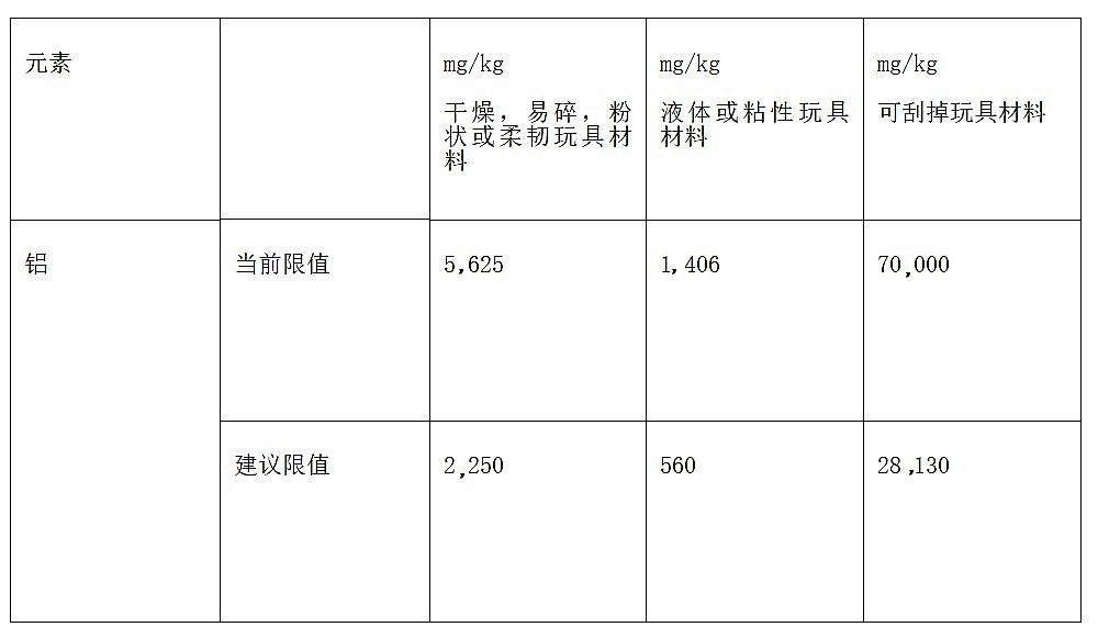 根据相关草案欧洲委员会对玩具中的铝的迁移限值做了提高,具体如下: