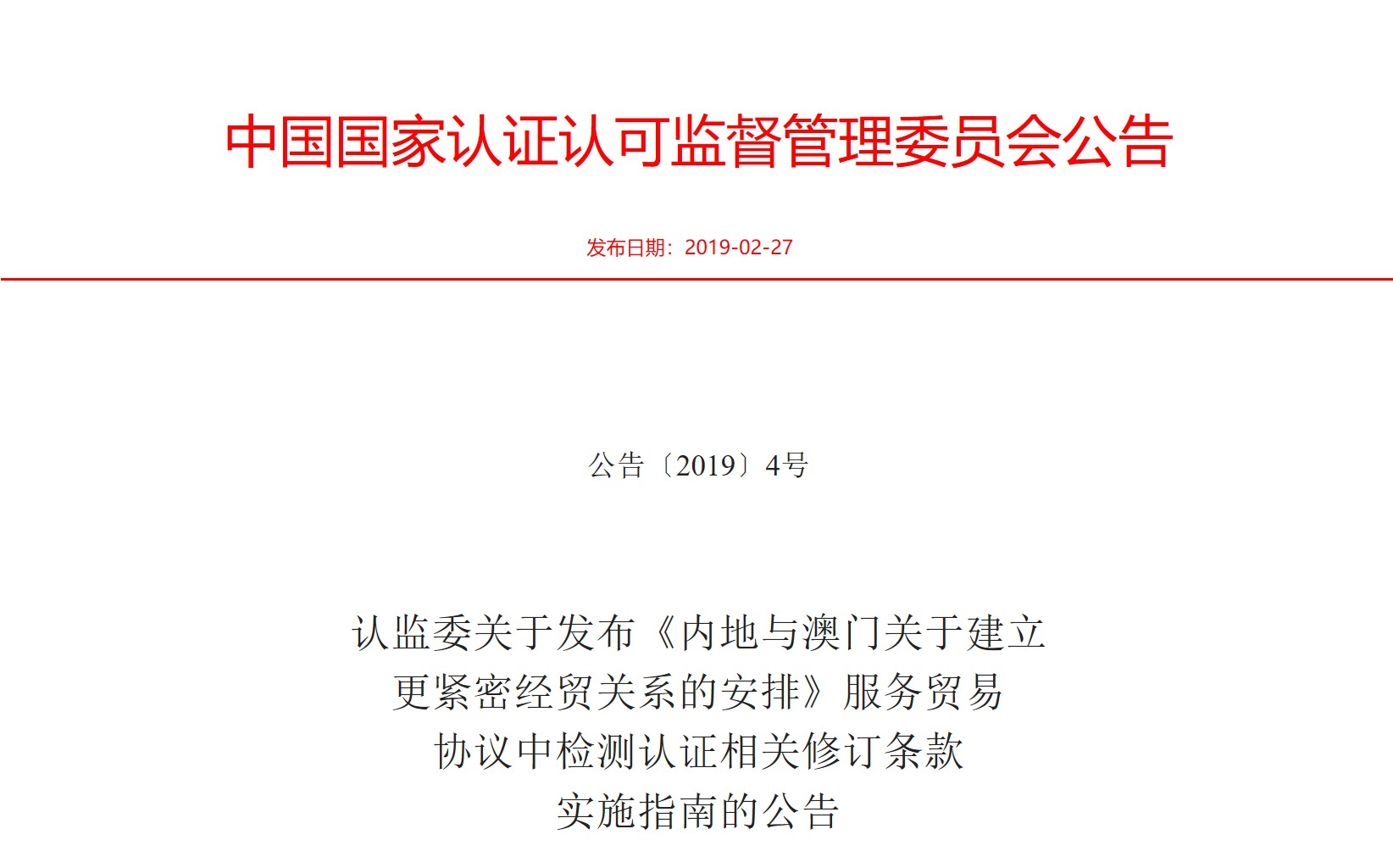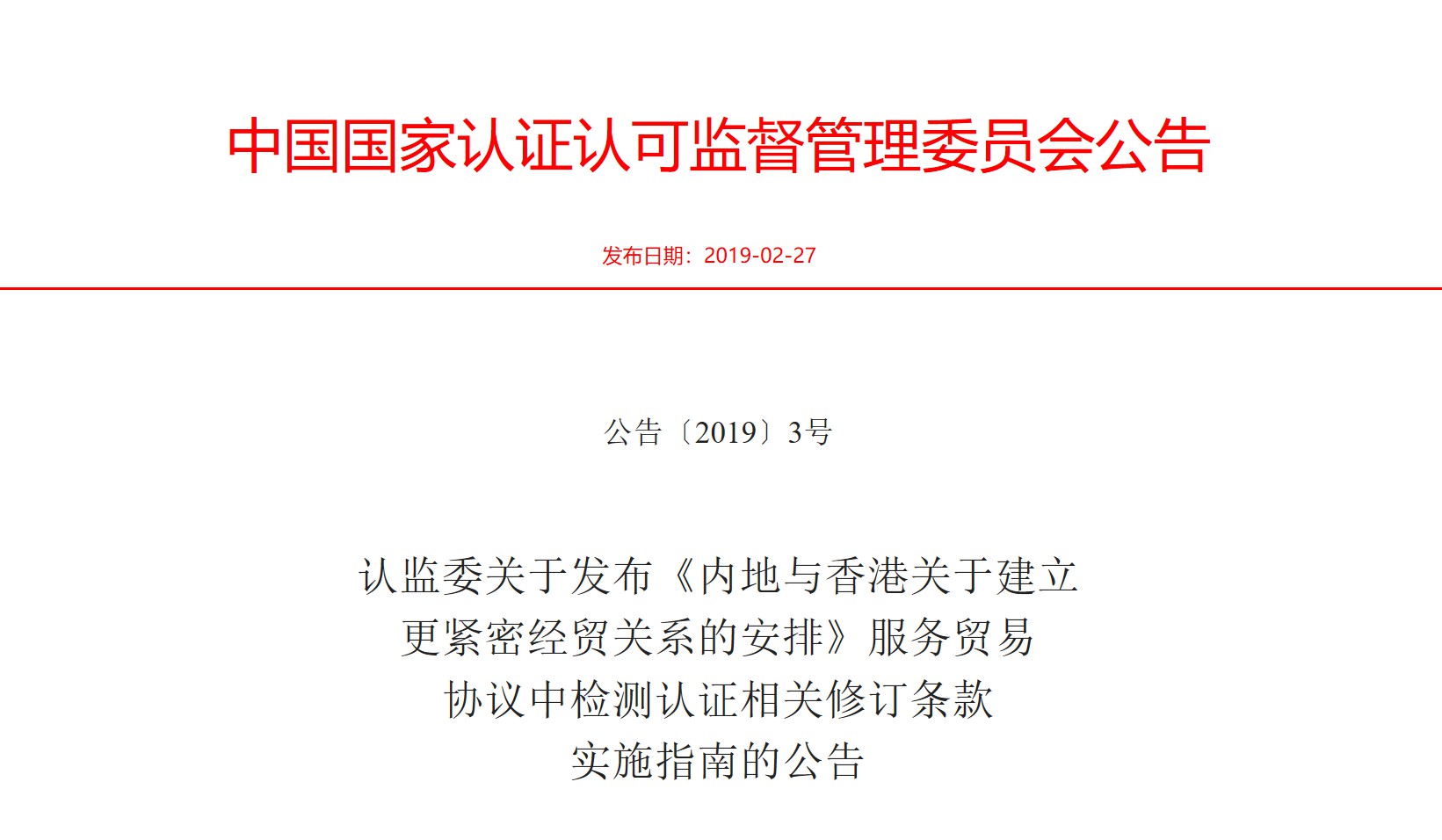 天纵检测(SKYLABS)注意到昨日(2019年2月27日)国家认监委在其网站上公开了两个公告,分别是“关于《内地与香港关于建立更紧密经贸关系的安排》服务贸易协议中检测认证相关修订条款的实施指南”和“关于《内地与澳门关于建立更紧密经贸关系的安排》服务贸易协议中检测认证相关修订条款的实施指南”。