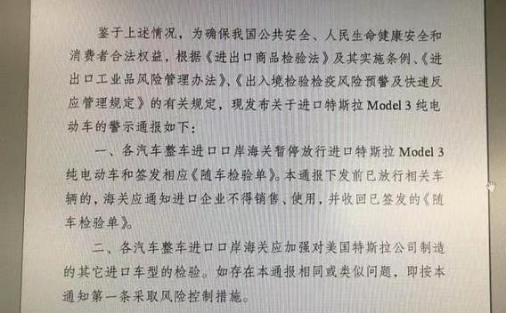 这份疑似从海关流出的文件显示,特斯拉Model 3车型疑似存在一定的安全风险,因此依据《进出口商品检验法》海关将对这种车型进行重点检验。
