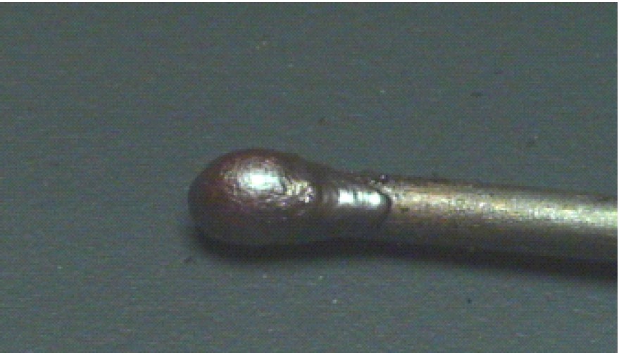 一次短路熔珠在形成时,因环境温度较低,只有在短路点短路瞬间处于高温状态,而整个导线的温度并不高,其金相组织仍然呈方向性,所以熔珠过度区(熔珠与导线衔接处)的界限比较明显。