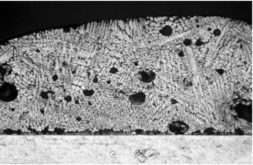 由于短路熔痕在结晶时的过冷度和冷却速度等条件不同,经实验表明,一次短路熔痕的显微组织大都是由细少的柱状晶组成的。而二次短路熔痕的显微组织都是由等轴晶组成,且被很多气孔分割,出现较多粗大晶界。