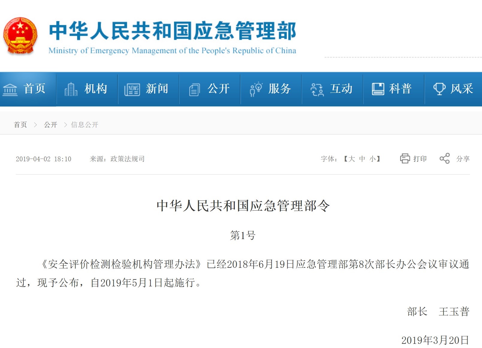 天纵检测(SKYLABS)注意到在2019年4月2日中华人民共和国应急管理部发布了“应急管理部令第1号令”即正式对外公布了相关的《安全评价检测检验机构管理办法》,此办法将在2019年5月1日起施行。