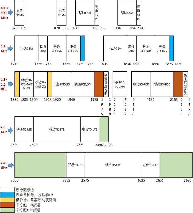 天纵君(SKYLABS)把这6种模式和三个运营商的频率划分,汇合成了一个图,以便大家能一目了然的理解自己全网通手机所支持的频段都有哪些。