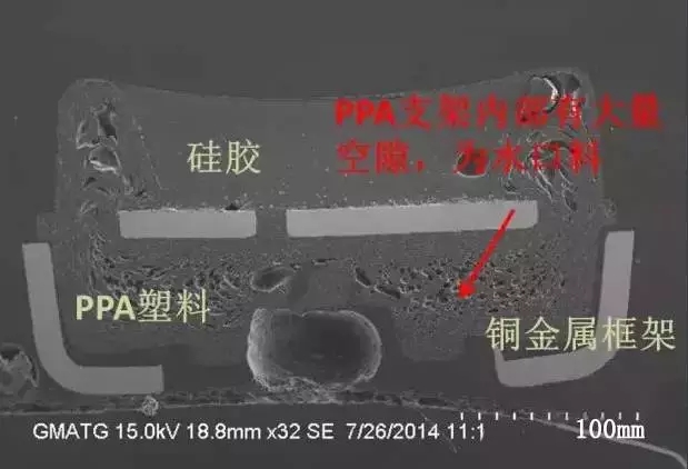 某公司在客户应用中发现使用2个月后的灯珠支架有发黄断裂的现象,因此委托检测鉴定支架失效的原因。在对灯珠支架做切片后,通过扫描电镜SEM的观察,发现PPA支架内部有大量的孔隙,这相对为典型的再生料特征。这是因为PPA塑料回收再生过程中会产生许多的空隙或其它的缺陷,并且孔隙的数量随着再生次数的增多而增加。