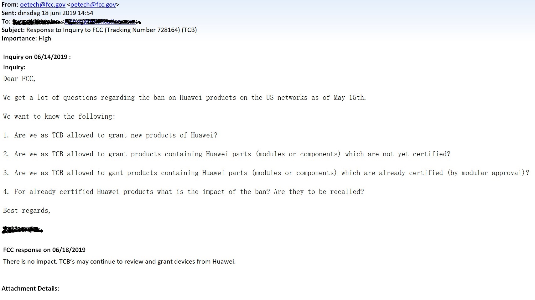 天纵检测(SKYLABS)昨日收到了美国FCC和相关认证机构(TCB)发给实验室的邮件,确认可以继续对华为产品设备进行FCC的认证工作。