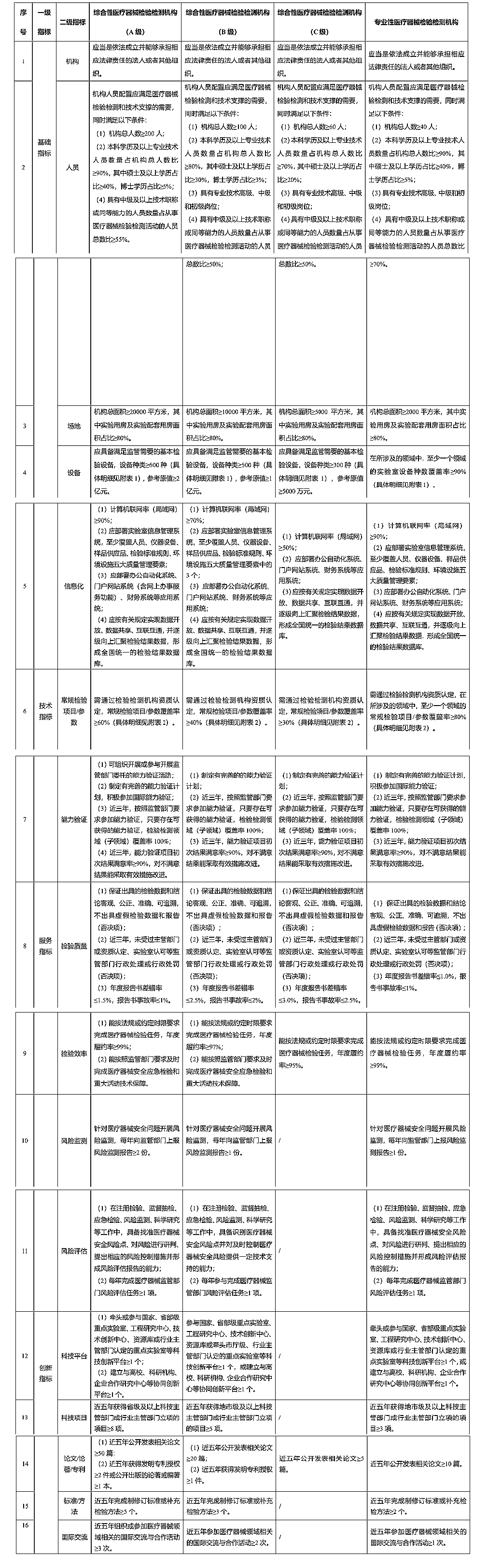 根据此行发布的指导原则,医疗器械检验检测机构将分为综合性医疗器械检验检测机构和专业性医疗器械检验检测机构。综合性医疗器械检验检测机构能力建设层级采用A级“全面能力”、B级“较高能力”和C级“常规能力”三个层级。专业性医疗器械检验检测机构不分建设层级。具体能力要求定义如下:
