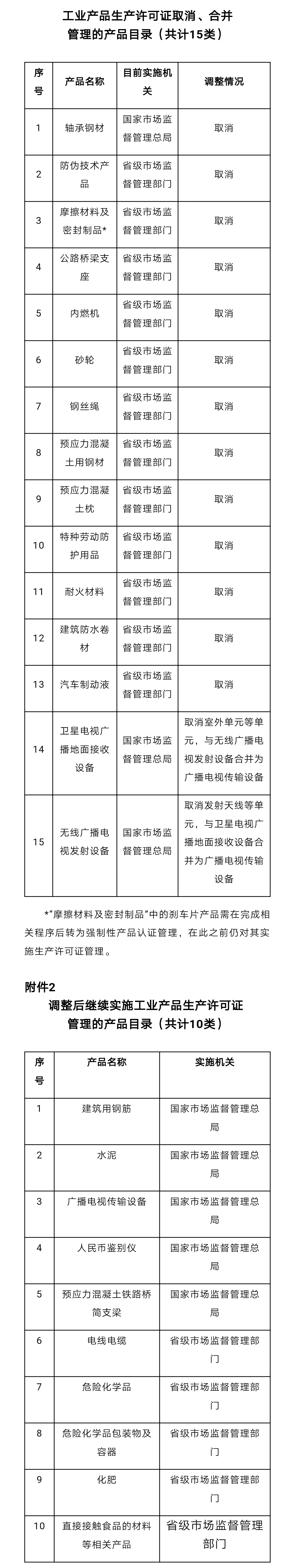 根据《决定》,取消了内燃机、汽车制动液等13类工业产品生产许可证管理,将卫星电视广播地面接收设备与无线广播电视发射设备2类产品压减合并为1类,对其中涉及安全、健康、环保的,转为强制性产品认证管理,认证费用由财政负担。调整后继续实施工业产品生产许可证管理的产品共计10类,其中,由国家市场监督管理总局实施的5类,由省级市场监督管理部门实施的5类。具体情况如下表所示:
