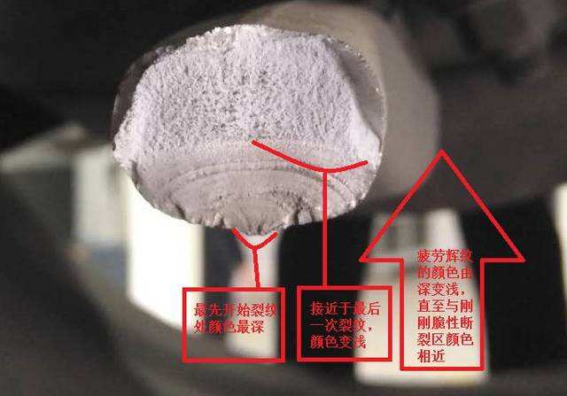 疲劳断裂的特点:断裂面和载荷方向呈90°角;断裂面非常光滑;如果存在多个初始断裂点,可能会有阶梯状;由于载荷的作用,可能存在显示断裂过程的条纹(Beach Mark)。