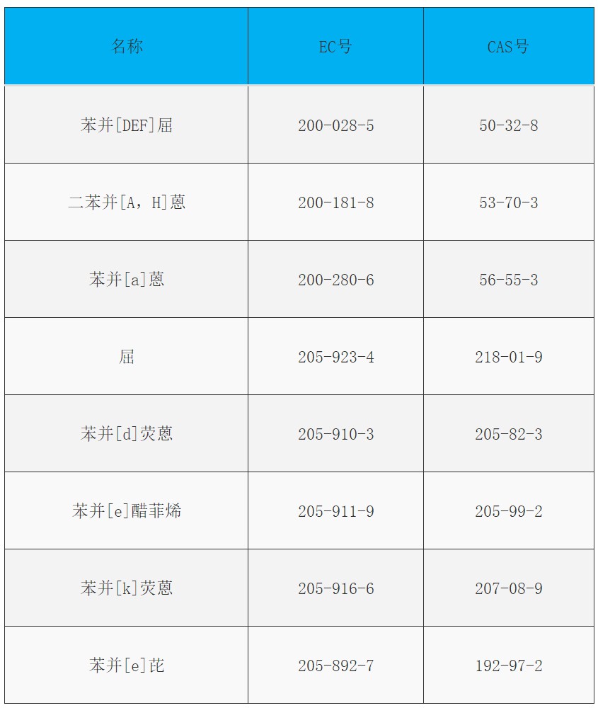 多环芳香烃(Polycyclic Aromatic Hydrocarbons, PAH)是指分子中含有两个或两个以上并环苯环结构的烃类化合物,并且不包含任何杂原子和取代基,它是最早被认识的化学致癌物。欧盟计划将8种多环芳香烃的总浓度限制含量降低到20mg/kg(按重量计算为0.002%),更接近个别多环芳香烃在供应给公众的物品中的限值(REACH限制清单第50项)。目前向公众供应的混合物中多环芳香烃的浓度上限为每一种物质100mg/kg或1000mg/kg。