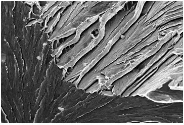 脆性断裂时,一般没有、或很少出现宏观变形特征,有明显的“人字花样”,可能出现碎块。脆性断裂一般通过两种断裂方式,即解理和沿晶中的一种,或混合扩展。微观特征有解理特征和沿晶特征。我们通过电镜观测下的典型脆性断口样本如下: