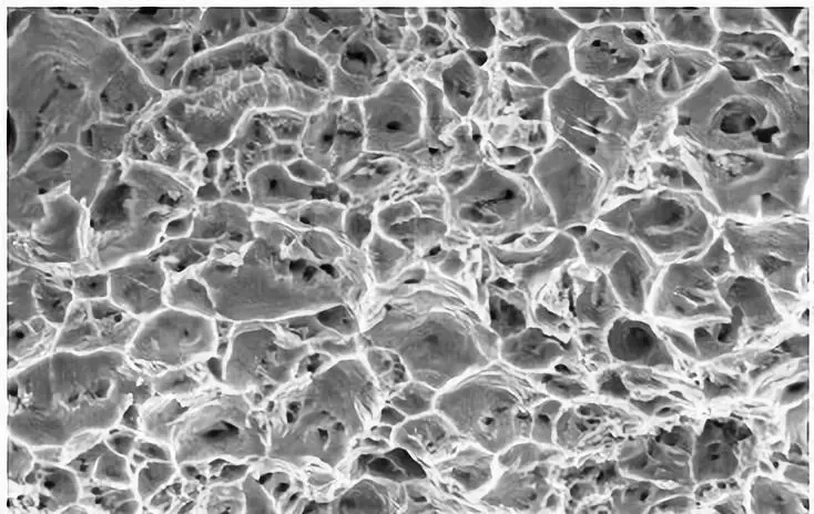 由于过载造成的塑性断裂,宏观一般有明显的塑颈变形,断口粗糙呈灰暗色。典型的微观特征是韧窝花样,根据受力的状态不同,微观特征有一定的变化。产生原因一般是材料没有足够的强度,使用条件超出了设计限值,零部件在工作时承受了异常的载荷。我们在电镜观测下的典型韧性断口样本如下所示: