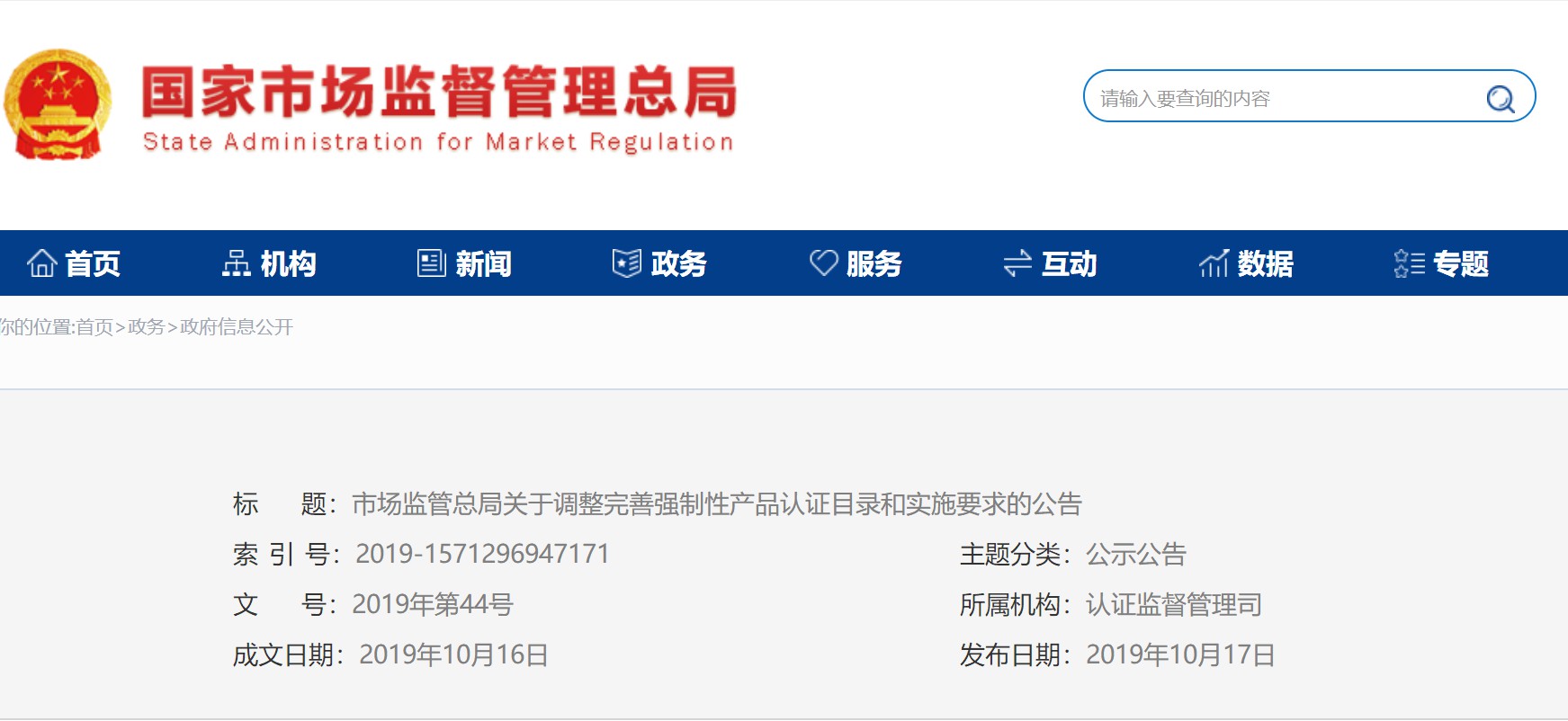 刚刚(2019年10月17日)市场监管总局发布了“2019年第44号”公告。此公告再次确认了强制性产品认证的本质属性为“保安全”,强制实施范围按照必要性和最小化的原则。基于以上原则,市场监管总局对强制性产品认证目录和实施要求作出了调整。