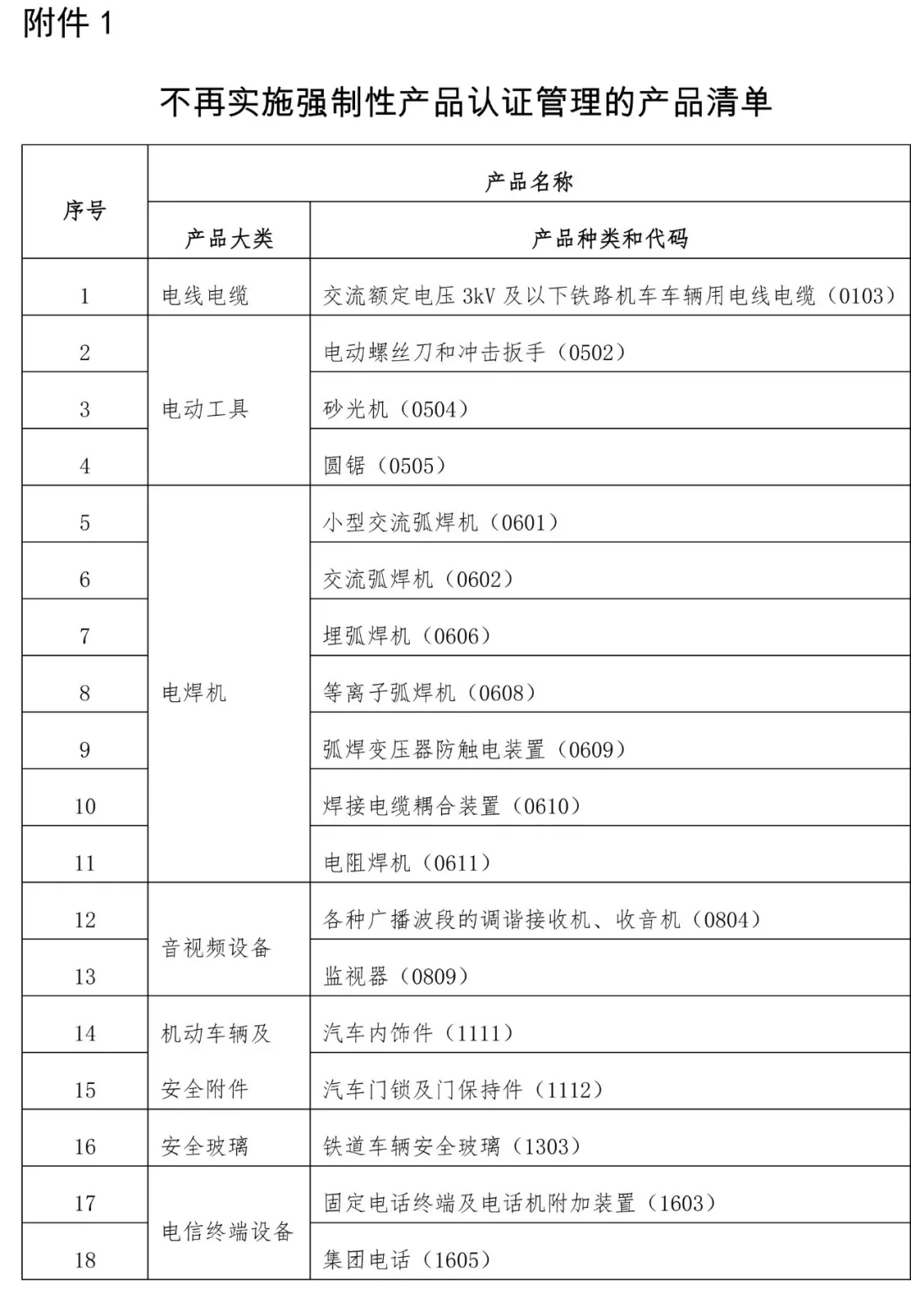 自本公告发布之日起,对18种产品(见附件1)不再实施强制性产品认证管理。相关指定认证机构应注销已出具的强制性产品认证证书,可根据企业意愿转为自愿性产品认证证书。认监委注销相关认证机构和实验室所涉及的强制性产品认证指定业务范围。