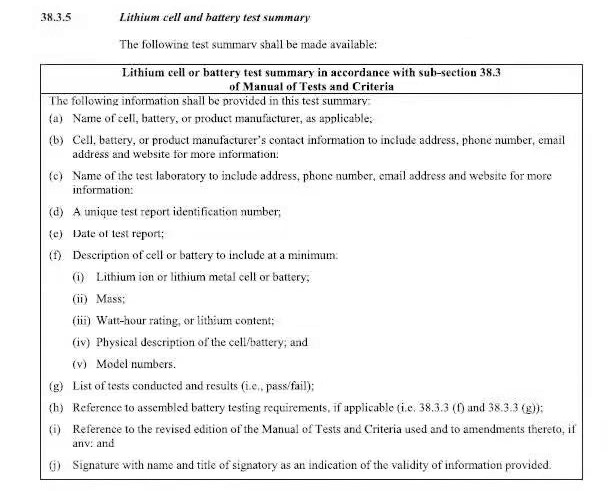 传统一份完整的UN38.3测试报告技术性较强,内容冗长,并不便于非专业人士阅读和了解锂电池的性能。基于此,联合国危险品专家委员会对要求进行了修改,并简化了测试报告的项目内容,要求改为以“试验概要,Test Summary”的形式提供相关锂电池的安全信息。该试验概要规定了10项基本内容,其中将包含完整的企业名称、地址、电话、邮箱、网址等及相应的电池信息与测试信息。具体要求如下: