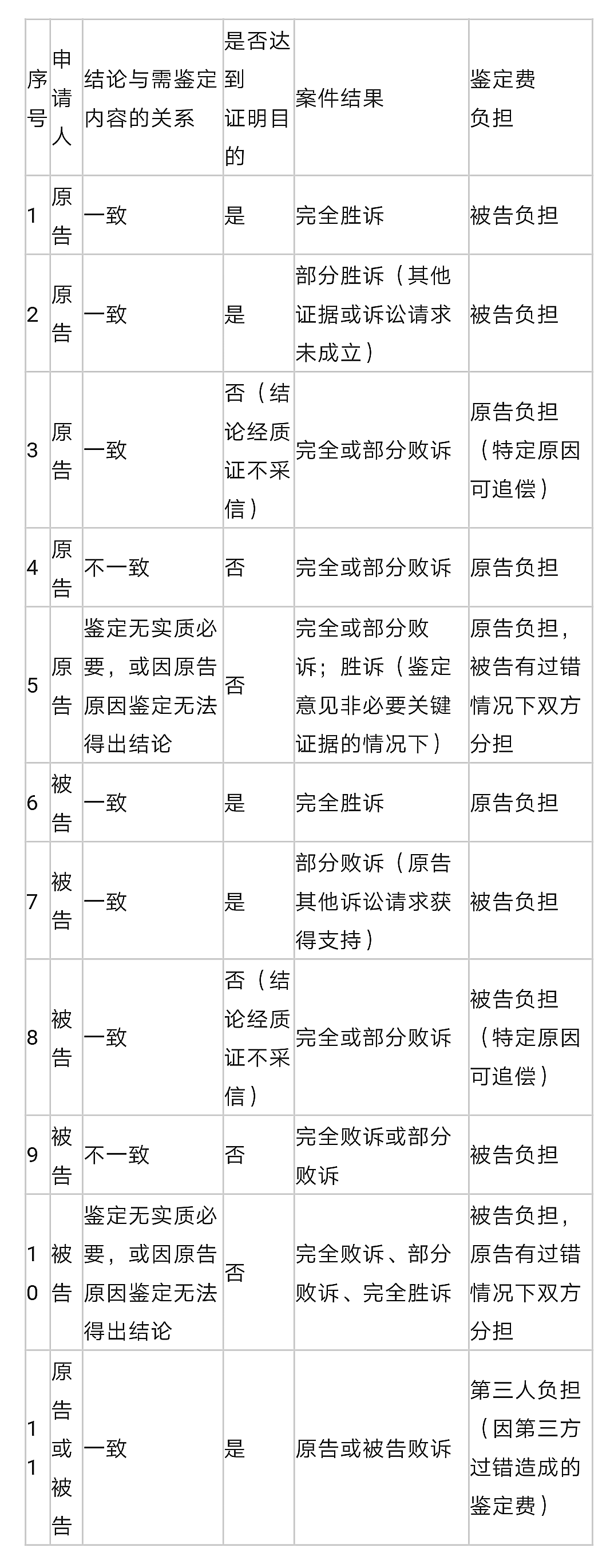 从上表我们可以看出司法鉴定费的负担与当事人的胜诉、败诉有一定关系但并不具有完全必然的联系,相对说来,他们更加与当事人对鉴定费的支出是否有过错更有关联性,具体的负担比例,法院常见以过错原则为基础进行综合判断。