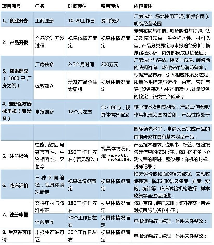 对于新进(初创)的医疗器械企业而言,产品从研发设计阶段到走向消费市场,要经历漫长环节。我们近日看到有同业针对新进的医疗器械企业整理了从工商注册、产品设计开发、体系建立、注册检测、临床试验、注册申报、生产许可申请、产品上市等医疗器械企业必要阶段的图表说明。