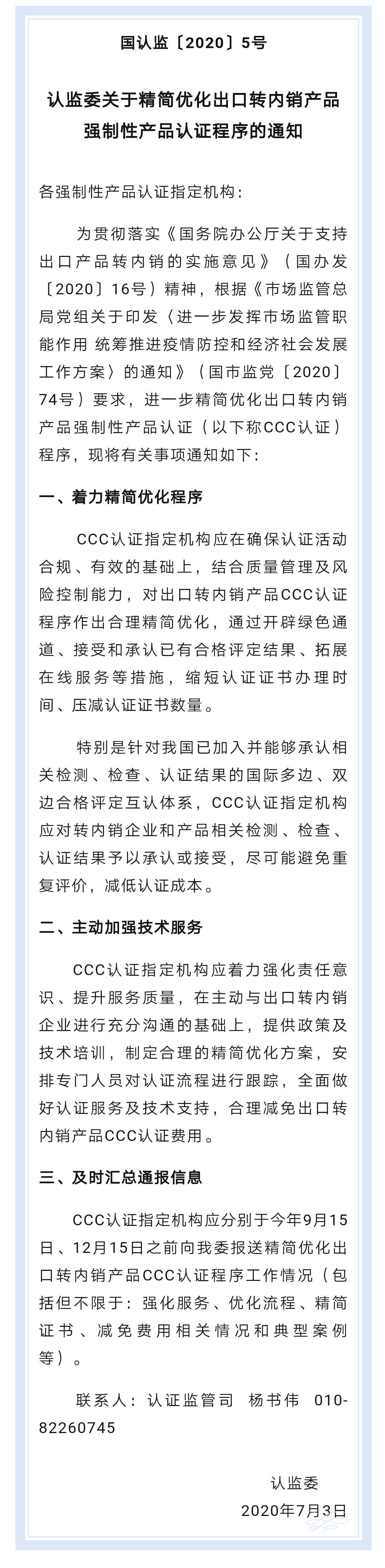 天纵检测(SKYLABS)注意到,2020年7月3日国家认监委发布了《认监委关于精简优化出口转内销产品强制性产品认证程序的通知》即“国认监〔2020〕5号”文。