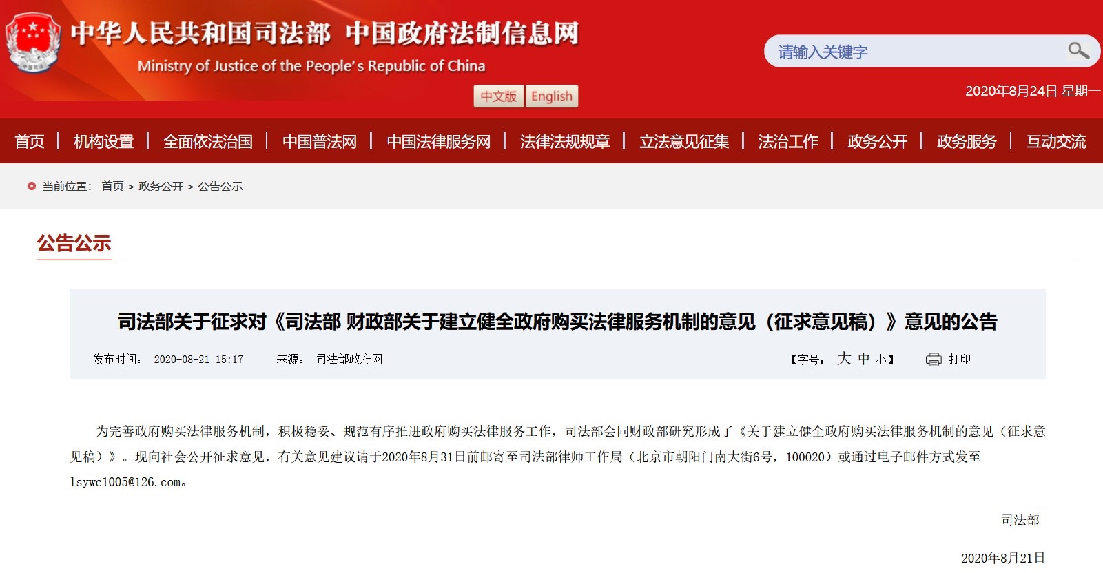天纵鉴定(SKYLABS)近日注意到,司法部在2020年8月21日在其官网上发布了“司法部关于征求对《司法部 财政部关于建立健全政府购买法律服务机制的意见(征求意见稿)》意见的公告”(以下简称“公告”),并正式向社会公开征求意见。