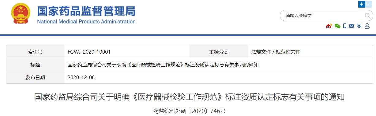 天纵检测(SKYLABS)注意到,就在2020年12月8日,国家药监局综合司发布了“关于明确《医疗器械检验工作规范》标注资质认定标志有关事项的通知”。